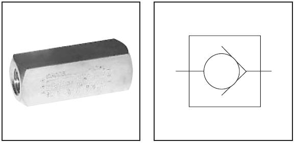 Las válvulas check de la serie “C” permiten el libre flujo en una dirección y un bloque seguro en la dirección inversa. Cuando la presión a través de la válvula se incrementa hasta la presión de ruptura, la válvula abre. Cuando